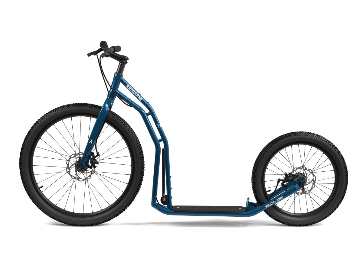 Yedoo Arni is an off-road scooter with 26"/20" wheels, rugged tyres, a sturdy steel frame, and reliable disc brakes — ideal for mushers and wilderness rides.