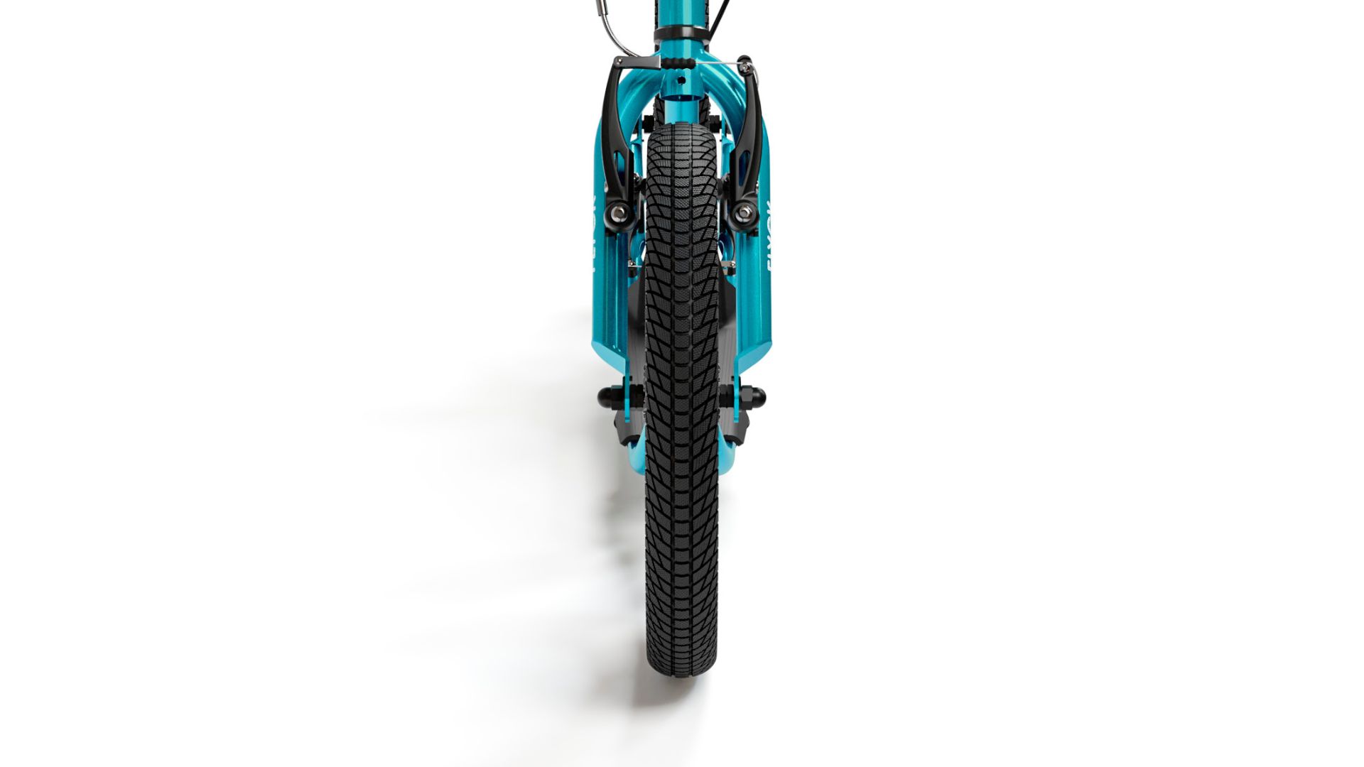 Užší pláště přispějí ke svižnému tempu a k bezproblémové jízdě také zúžené náboje (74 mm), které zeštíhlují boční profil koloběžky na minimum. To aby boční šířka koloběžky nebránila v pohybu nohou a neohrožovala dětské kotníky.